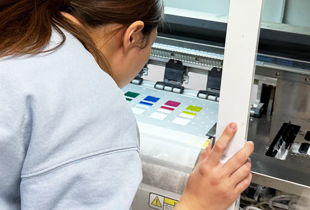 コーポレートカラーやアニメ系のフルカラーイラストなど現物と色味が異なるわけにはいかないグッズ制作の場合、お客さまから色味サンプルをお預かりして見比べながら何度もテストして色味を近づけていきます。紙のプリンターで出力した色味と最初から近い色がでることはないため少なくとも5〜6回は出力の設定を調整してサンプルとの違いを目視で確認しては調整を繰り返します。