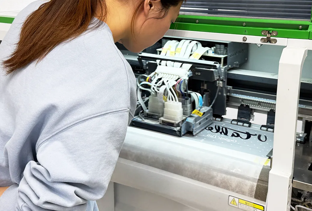 DTFプリントは機械の設定をコントロールして色味を合わせる必要があるのですが、同じ機材でもそれぞれの特徴があります。これは「不良」という訳ではなく機材の個体差で、赤の発色が強いもの、青の発色が弱いなど機材の担当者が機材の特徴を把握しておりデザインに応じて複数ある機材から最適な機材を選択した上で更に細かい設定をして色の再現度を高めています。