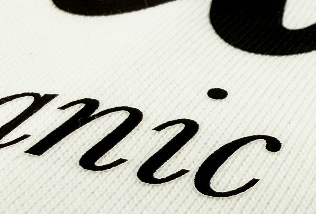 会社のロゴや版権のあるコンテンツ(IP)など、高い再現性が求められるビジネスシーンでのプリントに多く用いられる加工方法で6pt (約2mm) の文字も目視できるほど細かいプリントの精度が高いです。