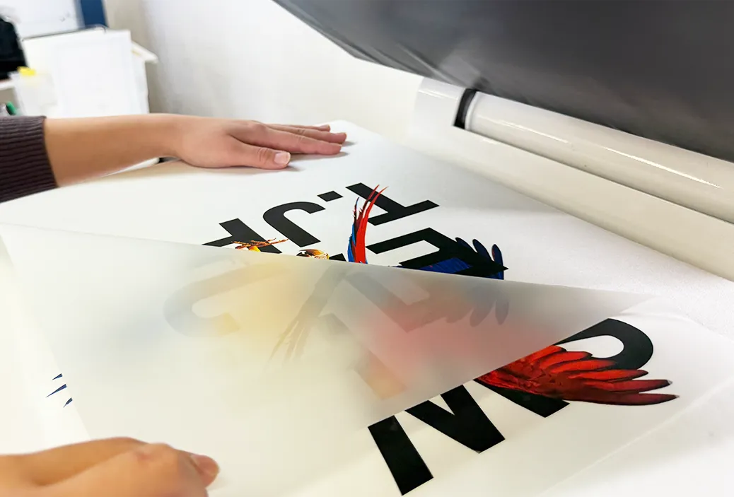 近年ではビジネスシーンで定番となっているDTFプリントは、専用のフィルムにデザインをプリントし、熱で溶ける接着剤 (ホットメルトパウダー) をつけて熱圧着します。