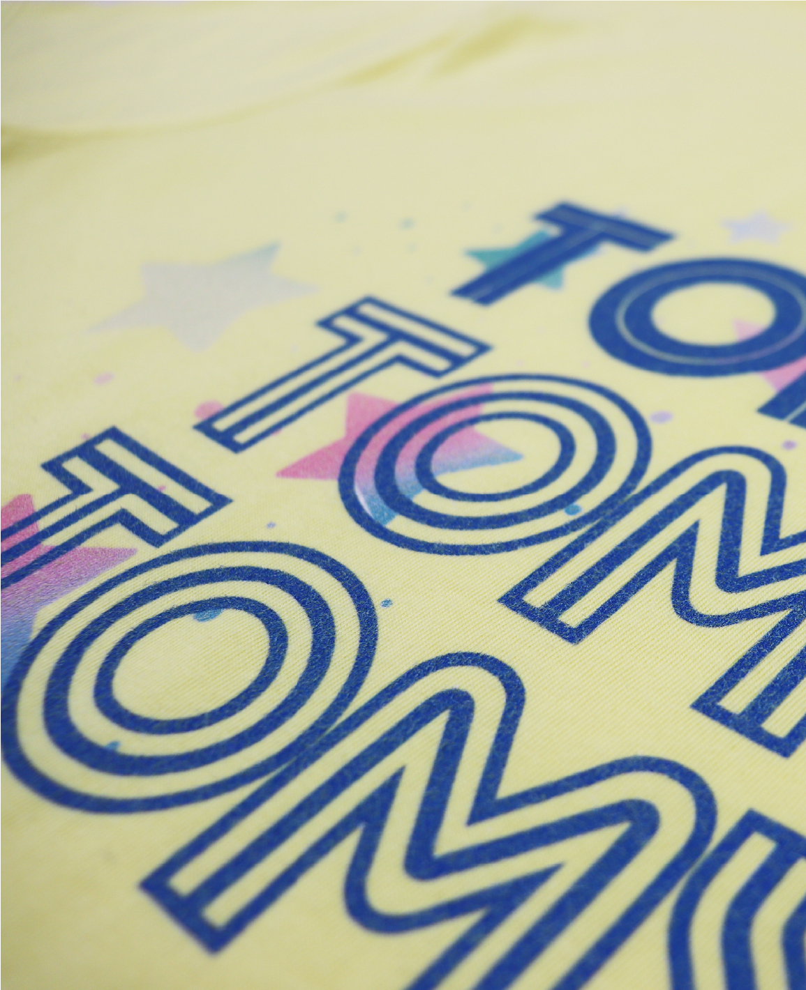 爽やかなライトイエローの生地にブルーを基調にしたデザインが相性が良く、夏らしい1枚に仕上がりました。