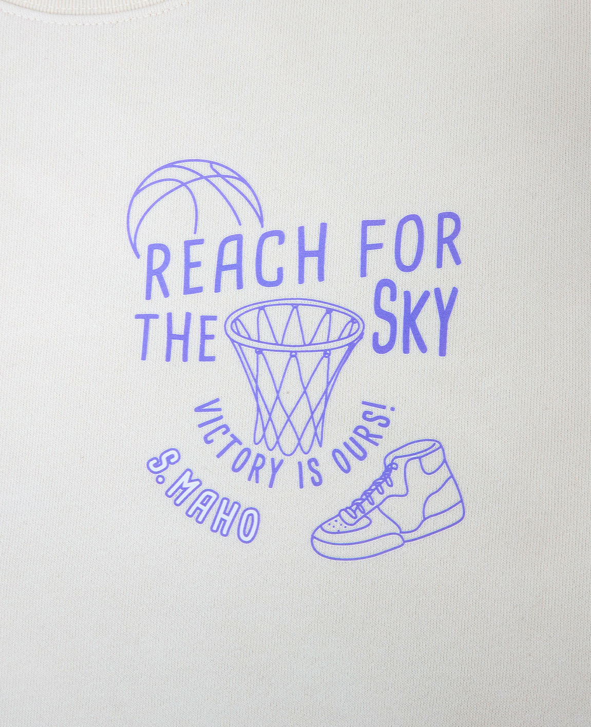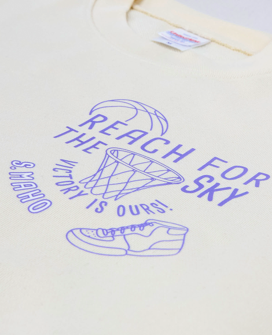印象的な「REACH FOR THE SKY」の文字に、ゴールやシューズのイラストがさり気なく配置されており、