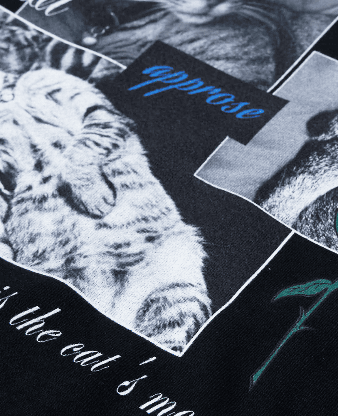 ブラックのボディに、猫のフォトグラフィックをコラージュ風に配置した印象的なデザインです。