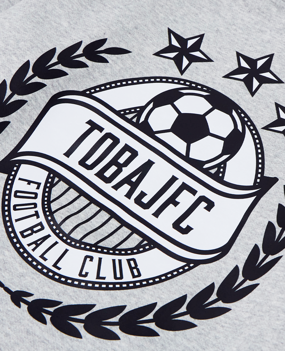 バックにはサッカーボールを中心に、星やリースを組み合わせたエンブレム風のロゴを大きくプリントしています。モノトーンのプリントなのでグレーのボディとも相性が良く、シンプルながらもクラブチームらしい存在感のあるデザインに仕上がっています。フルカラーシートは発色良く加工ができるので、目立たせたいデザインにおすすめです。