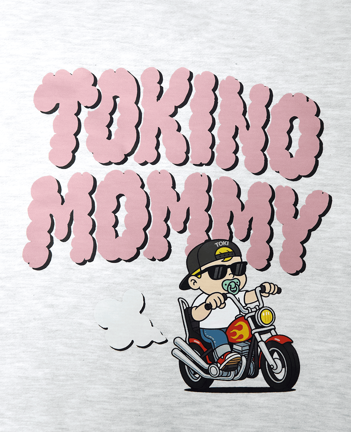 バックにはフロントと同じ「TOKINO MOMMY」のロゴを大きく配置し、さらにバイクに乗ったキャラクターのイラストを組み合わせた遊び心のあるデザインになっています。ポップな文字とイラストがマッチし、インパクトがありながらも親しみやすい雰囲気を演出しています。フルカラーシートでの加工は、デザインの色味がより鮮明に再現ができるので、デザインに色をはっきり出したい人におすすめです。