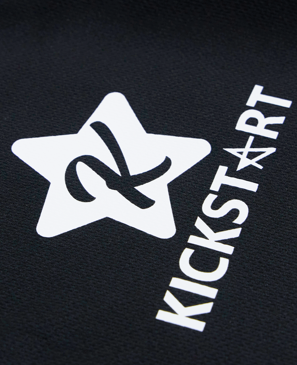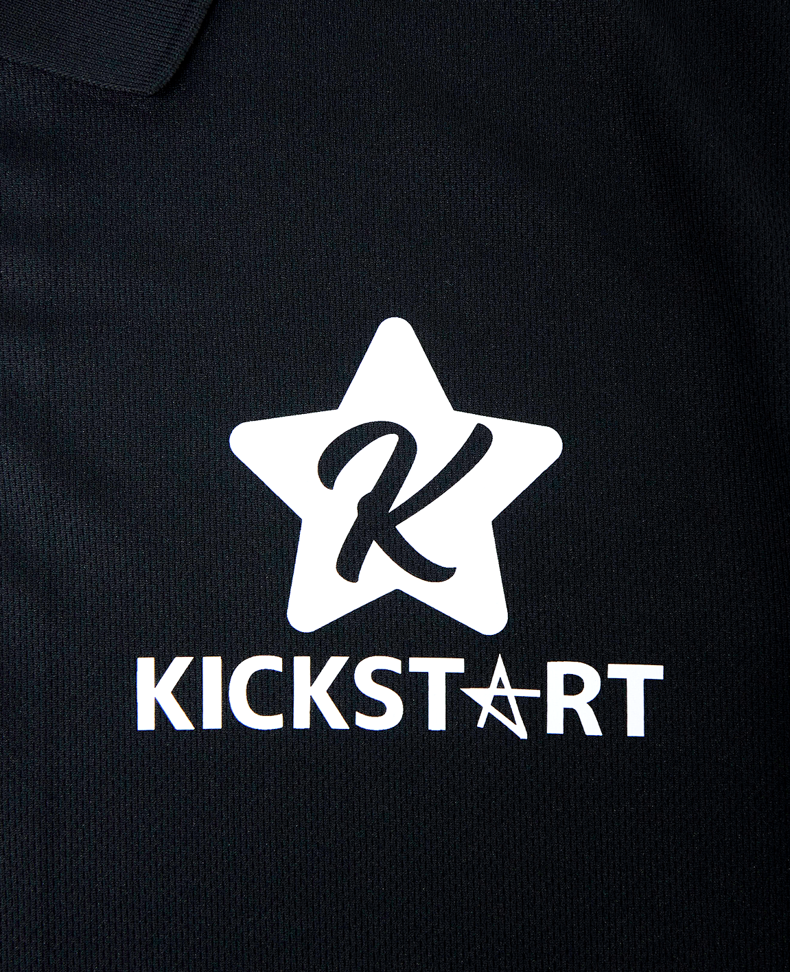 ネイビーのボディに、左胸へ星モチーフと「KICKSTART」のロゴをワンポイントでプリントしたシンプルなデザインです。ホワイトのプリントがしっかりと映え、落ち着いた中にも爽やかな印象を与えてくれます。単色のデザインで小数枚ご注文の場合は、よりお安く作成できる単色シートがおすすめです。
