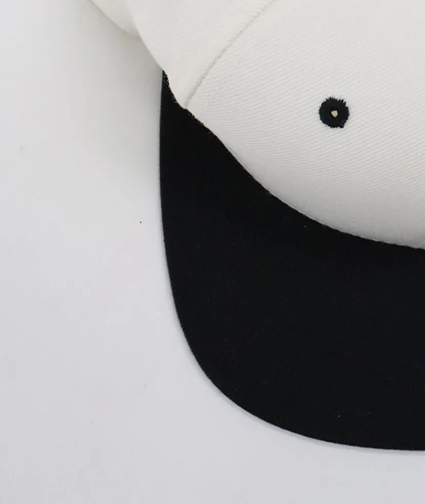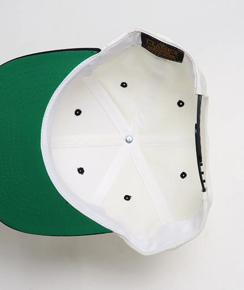 FLEXFITフラットバイザーキャップのツートーンバージョン。ネオンカラーを含むカラフルなラインナップはカジュアルシーンにもってこいです。バイザー部分とカラーを合わせた穴かがりや、つば下の緑サテンがおしゃれです。