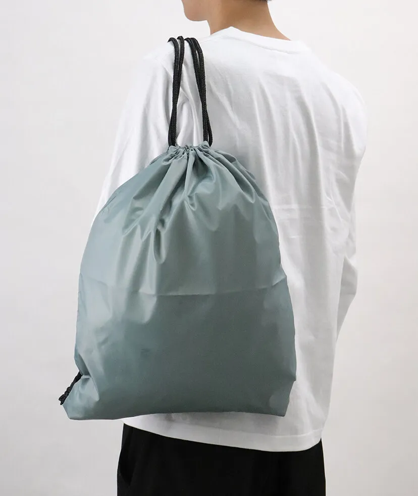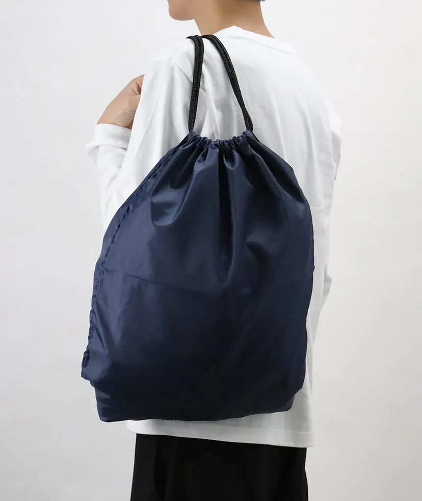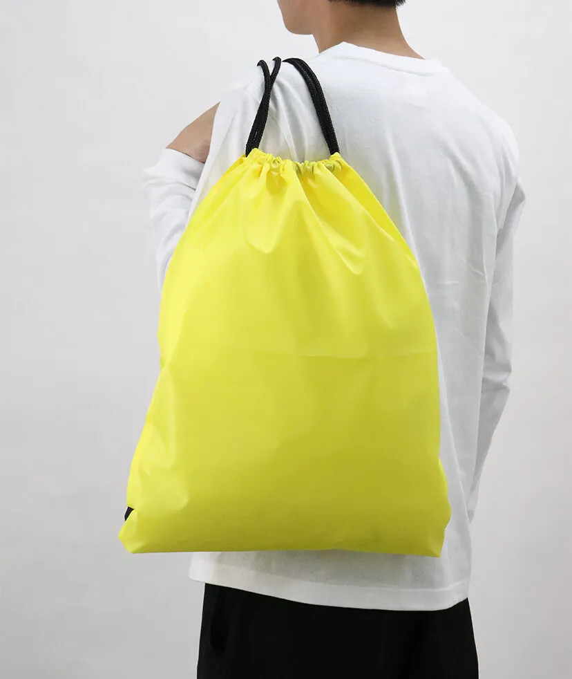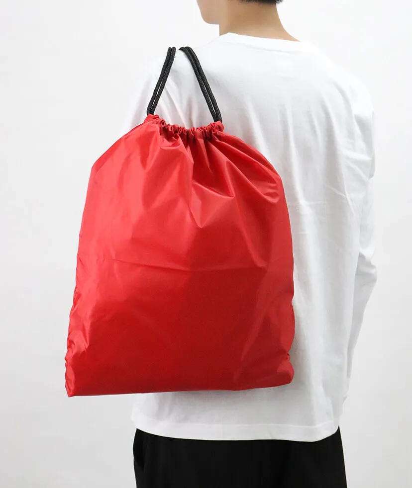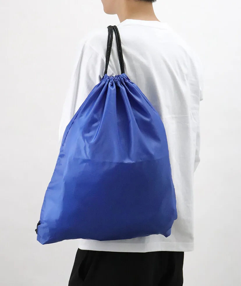 ナップザック式のバッグで、意外なほど大容量です。 ポリエステル100%なのでシャカシャカ感と撥水性があり、汚れがつきにくいのでスポーツシーンにもおすすめです。 イベントでも幅広く活躍する便利なアイテムです。
