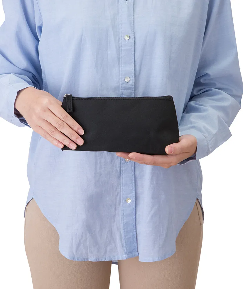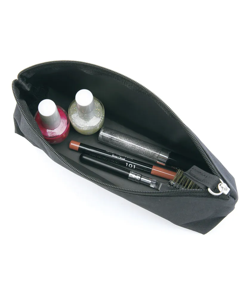 メイクポーチにも、筆記用具を入れるのにもちょうどいいサイズの三角型ポーチです。ブラックと白味のあるベージュがシックなイメージを演出します。