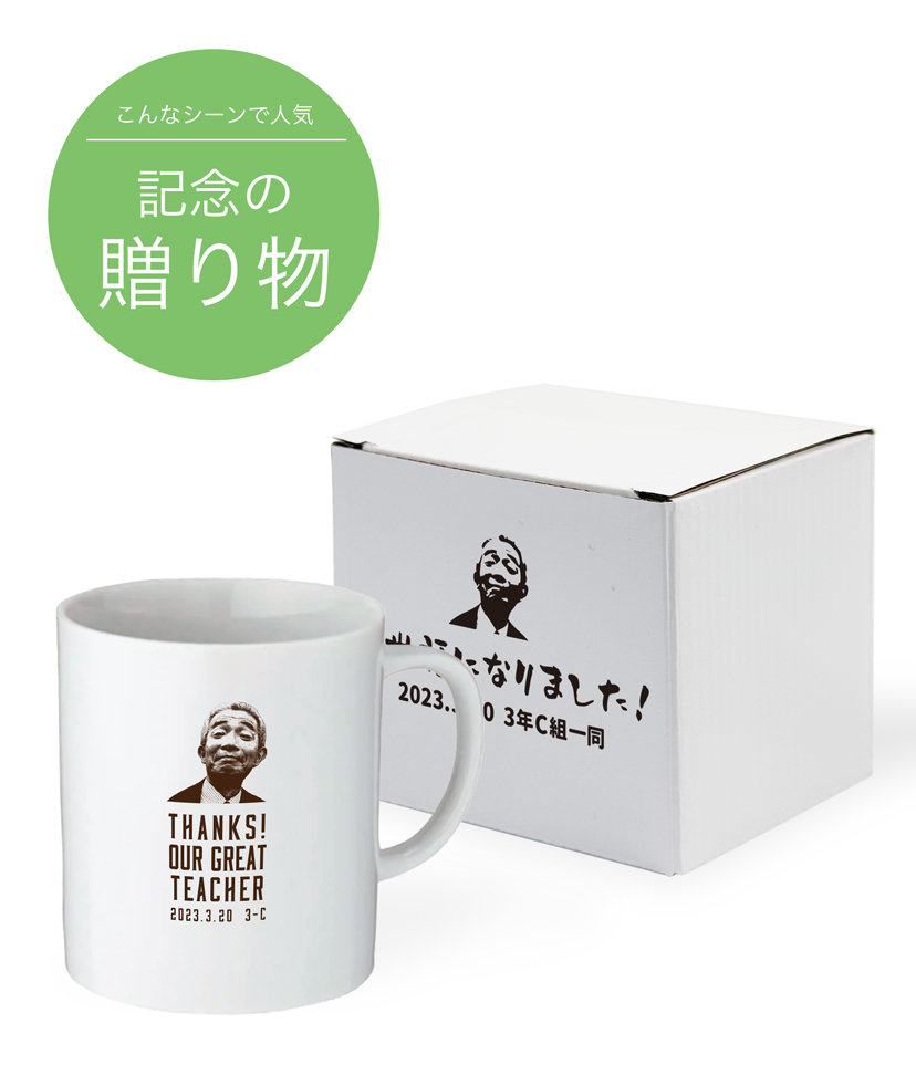 【ギフトにおすすめ】1個からつくれる、オリジナルマグカップと箱のセット。 記念品やプレゼントなどで贈るときに箱もオリジナルだと更にクオリティが上がり、思いが伝わりやすいです。 1個から注文可能で、写真などフルカラーのデザインもプリント可能です。