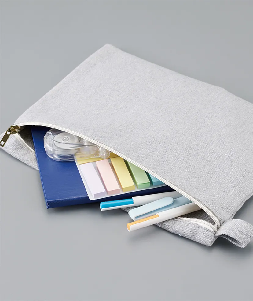 再生素材を使用した、普段使いしやすいフラット形状タイプのポーチです。フラット面にファスナーがついている為、カラビナやボールチェーン等につなげて持ち運ぶことができます。旅行時の小分けケースとしても、ペンや付箋などの文具を持ち運ぶポーチとしてもご活躍いただけるアイテムです。サイズはSS、S、M、L、ロングの5型展開でご使用用途に合わせ大きさをお選びいただけます。単色印刷からフルカラー印刷まで対応。お好きなデザインでオリジナルグッズをおつくり頂けます。アパレルの購入品特典やオープンキャンパスのノベルティなどおすすめの商品です。▼シャンブリック素材とは廃棄予定だった生地の切れ端を再利用したエシカルな素材。経糸・緯糸の色を変えて織り上げています。先染めの糸を使用しているため、堅牢度が良いこともポイントです。素材の特性上、生地にネップ(小さな糸の固まり)が出る場合があります