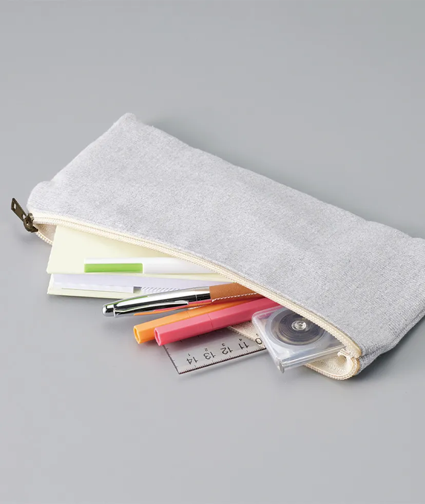 再生素材を使用した、普段使いしやすいフラット形状タイプのロングポーチです。ペンや付箋などを収納するステーショナリーポーチとしてぴったりなアイテムです。サイズはSS、S、M、L、ロングの5型展開でご使用用途に合わせ大きさをお選びいただけます。単色印刷からフルカラー印刷まで対応。お好きなデザインでオリジナルグッズをおつくり頂けます。アーテストグッズやオープンキャンパスのノベルティなどおすすめの商品です。▼シャンブリック素材とは廃棄予定だった生地の切れ端を再利用したエシカルな素材。経糸・緯糸の色を変えて織り上げています。先染めの糸を使用しているため、堅牢度が良いこともポイントです。素材の特性上、生地にネップ(小さな糸の固まり)が出る場合があります