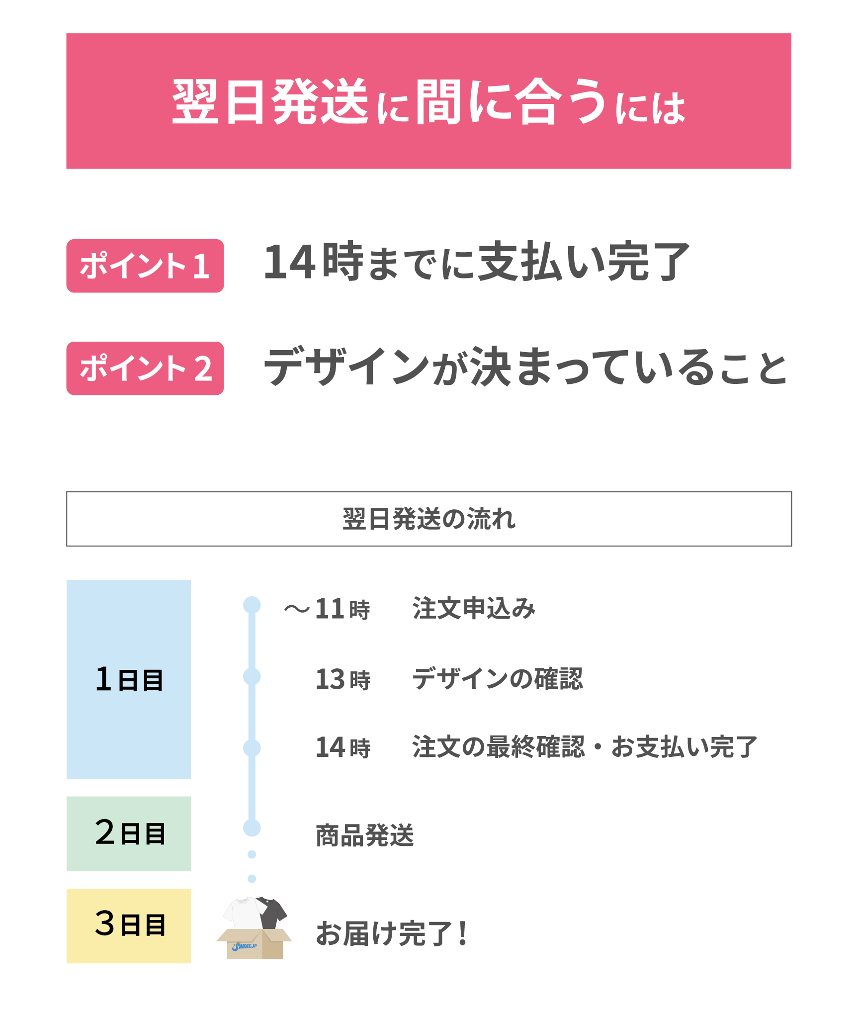 ご注文から最短翌日発送の特急プリントTシャツ! 14時までのご入金で翌日に発送が可能です。 商品カラーやサイズ・プリント方法が限定されますので、他のカラーやサイズをご希望の場合は通常商品からお選びください。 ※特急プリントTシャツは「写真撮影」サービスは対象外となります。