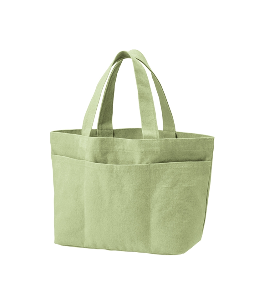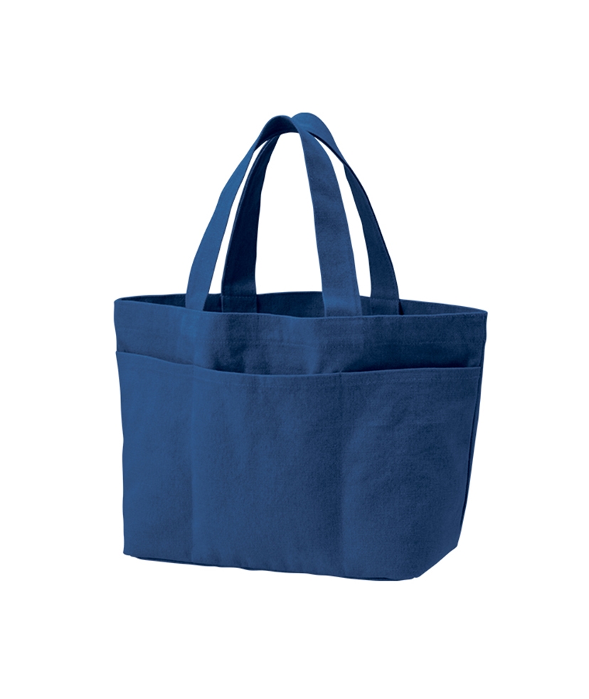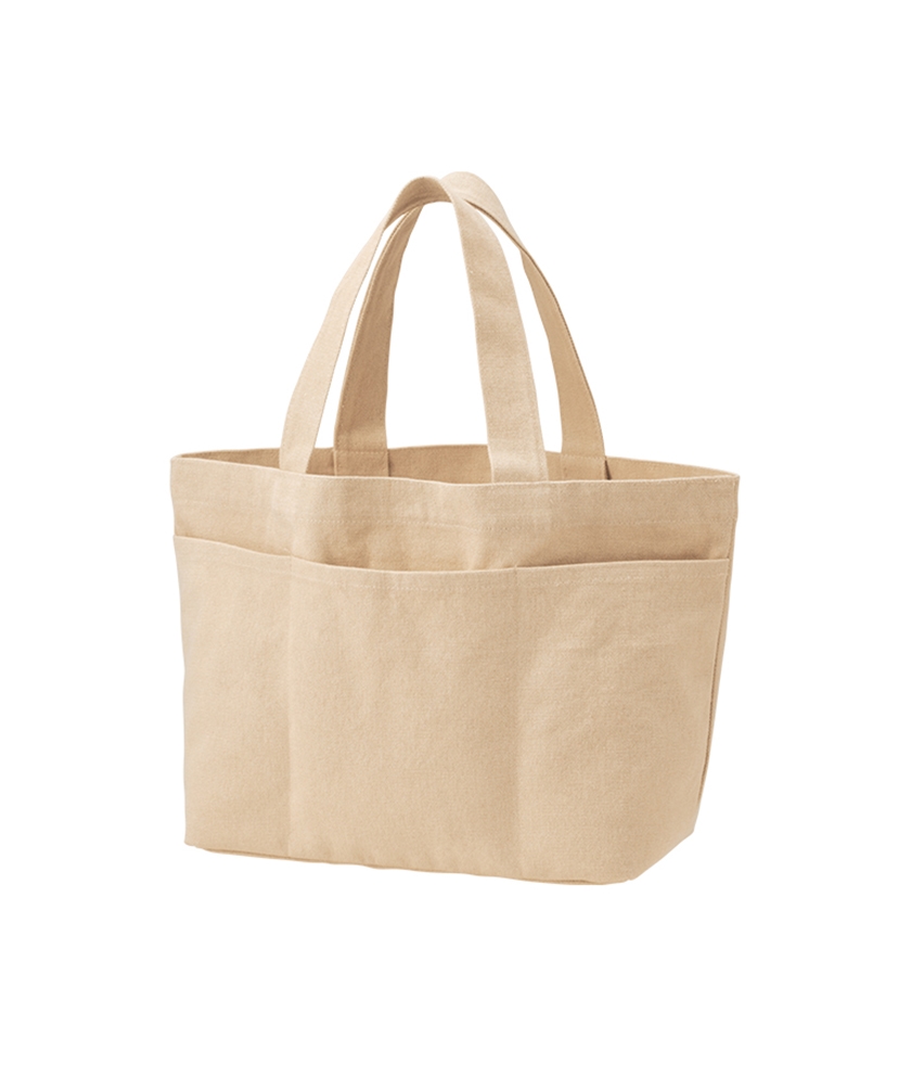 程よいウォッシュの風合いがおしゃれなトートバッグです。 正面にポケット3つがついており、デザイン性だけではなく利便性にも優れています。 M・Lの2サイズ展開で、Mサイズはランチバッグとしても、 またボトルや傘などもしっかり入るためお出かけバッグとしてもぴったりです。 フルカラー印刷にも対応しており、前面ポケット部分に印刷できるので デザインを生かしたオリジナルノベルティやグッズを製作できます。 食品店の購入特典やブランドロゴ入り高級ノベルティなどにもおすすめです。
