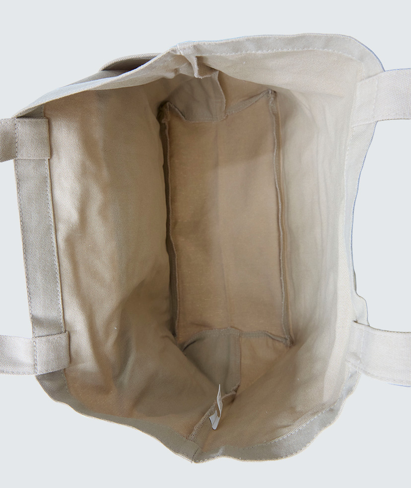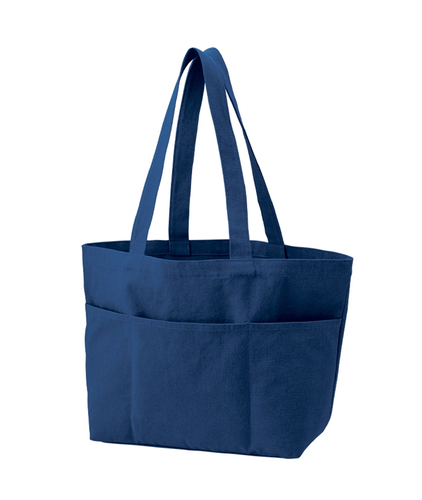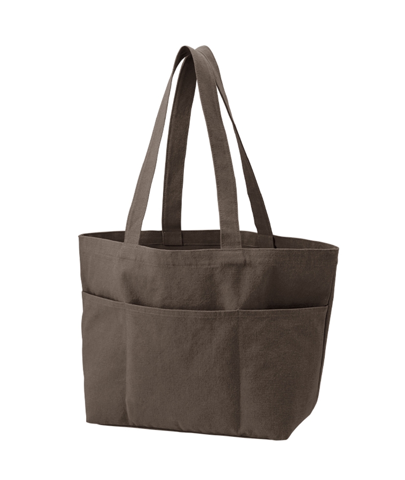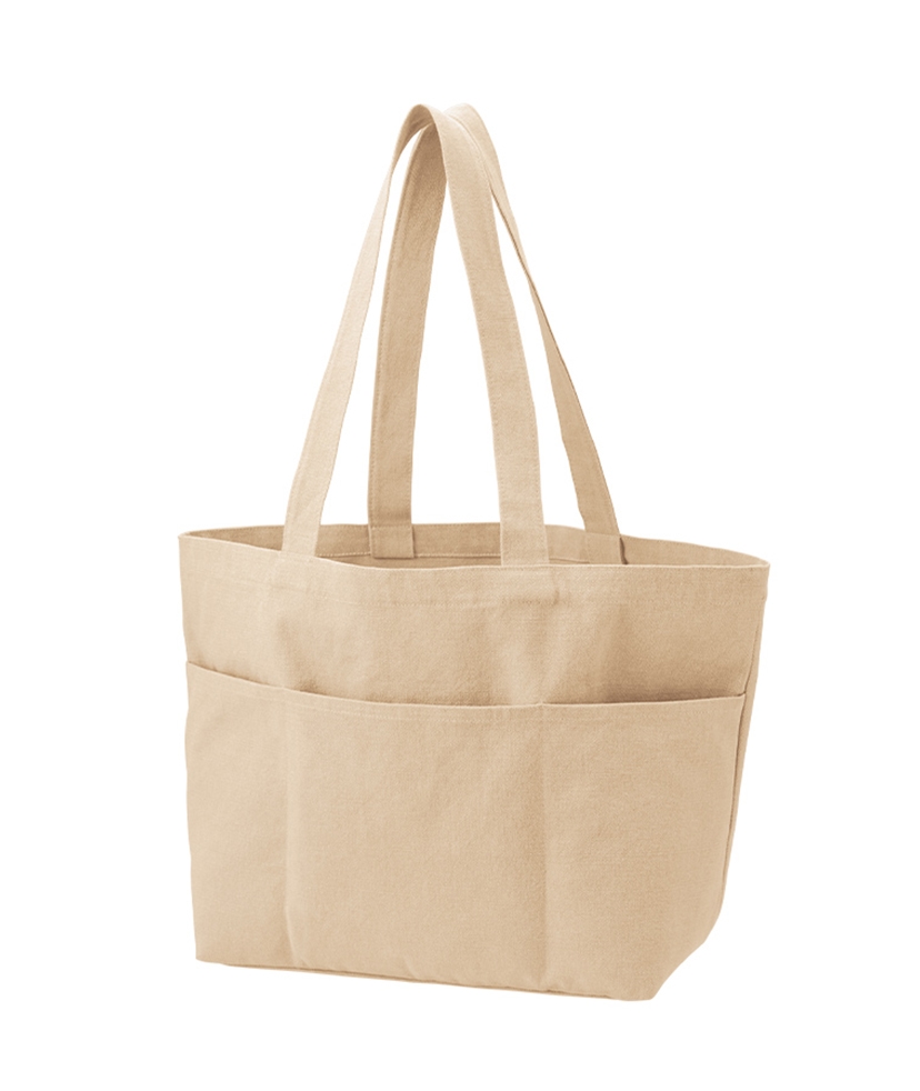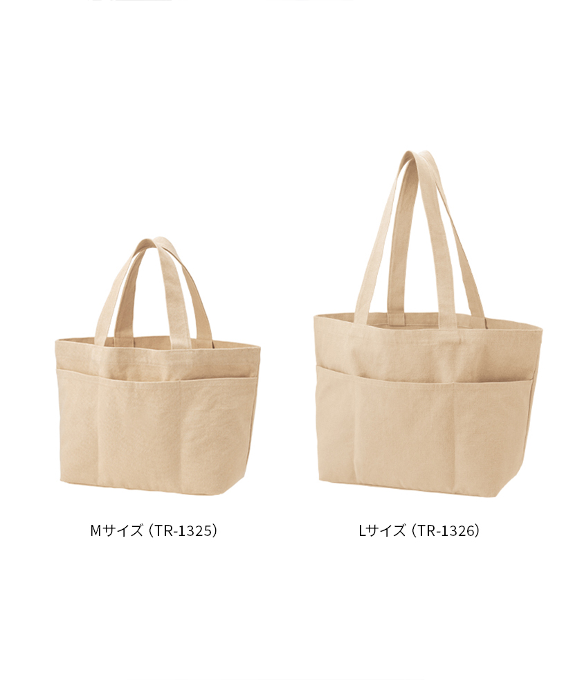 程よいウォッシュの風合いがおしゃれなトートバッグです。 正面にポケット3つがついており、デザイン性だけではなく利便性にも優れています。 M・Lの2サイズ展開で、Mサイズはランチバッグとしても、 またボトルや傘などもしっかり入るためお出かけバッグとしてもぴったりです。 フルカラー印刷にも対応しており、前面ポケット部分に印刷できるので デザインを生かしたオリジナルノベルティやグッズを製作できます。 食品店の購入特典やブランドロゴ入り高級ノベルティなどにもおすすめです。