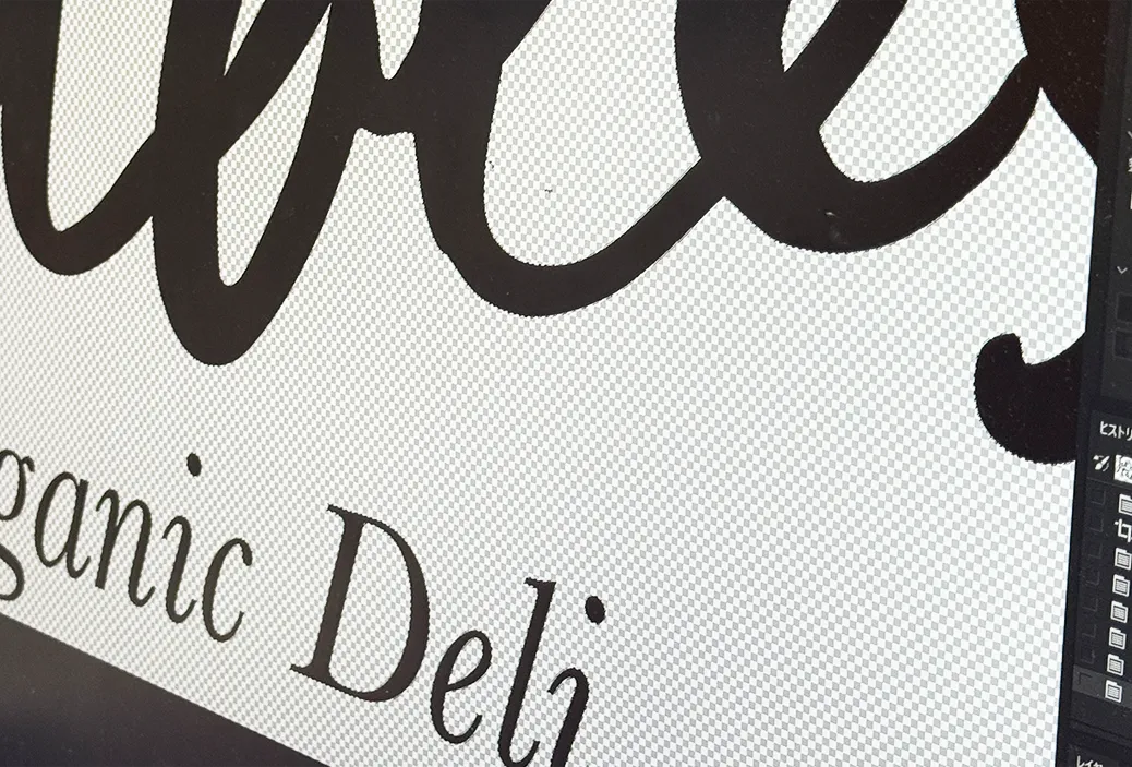 会社のロゴや版権のあるコンテンツ(IP)など、高い再現性が求められるビジネスシーンでのプリントに多く用いられる加工方法で6pt (約2mm) の文字も目視できるほど細かいプリントの精度が高いです。