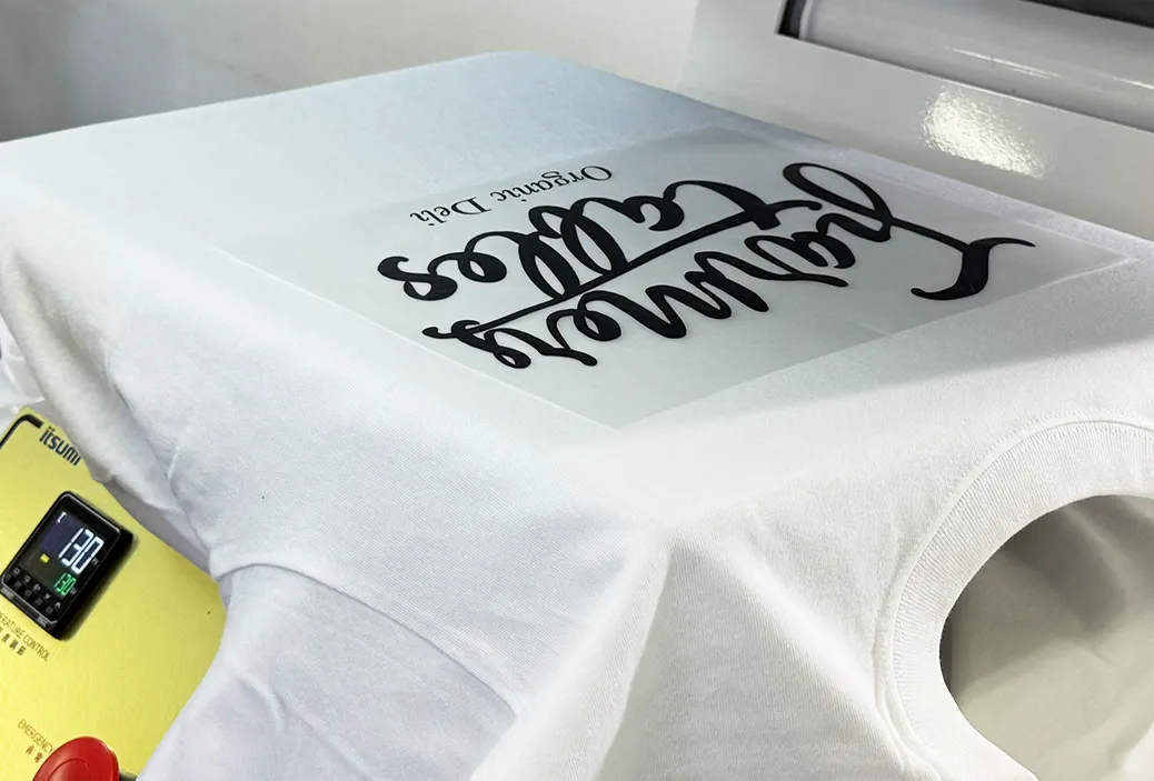近年ではビジネスシーンで定番となっているDTFプリントは、専用のフィルムにデザインをプリントし、熱で溶ける接着剤 (ホットメルトパウダー) をつけて熱圧着します。