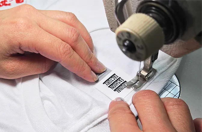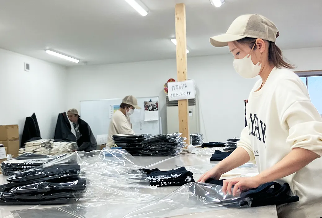 衣類の加工現場では製品自体の縫製不良の他にも、インク汚れやピンホールなど思わぬ予想外な不良も発生します。それらを見逃さない検品体制と徹底できるだけの環境づくりに力をいれてお客さまに良品のみを届けられるように取り組んでいます。