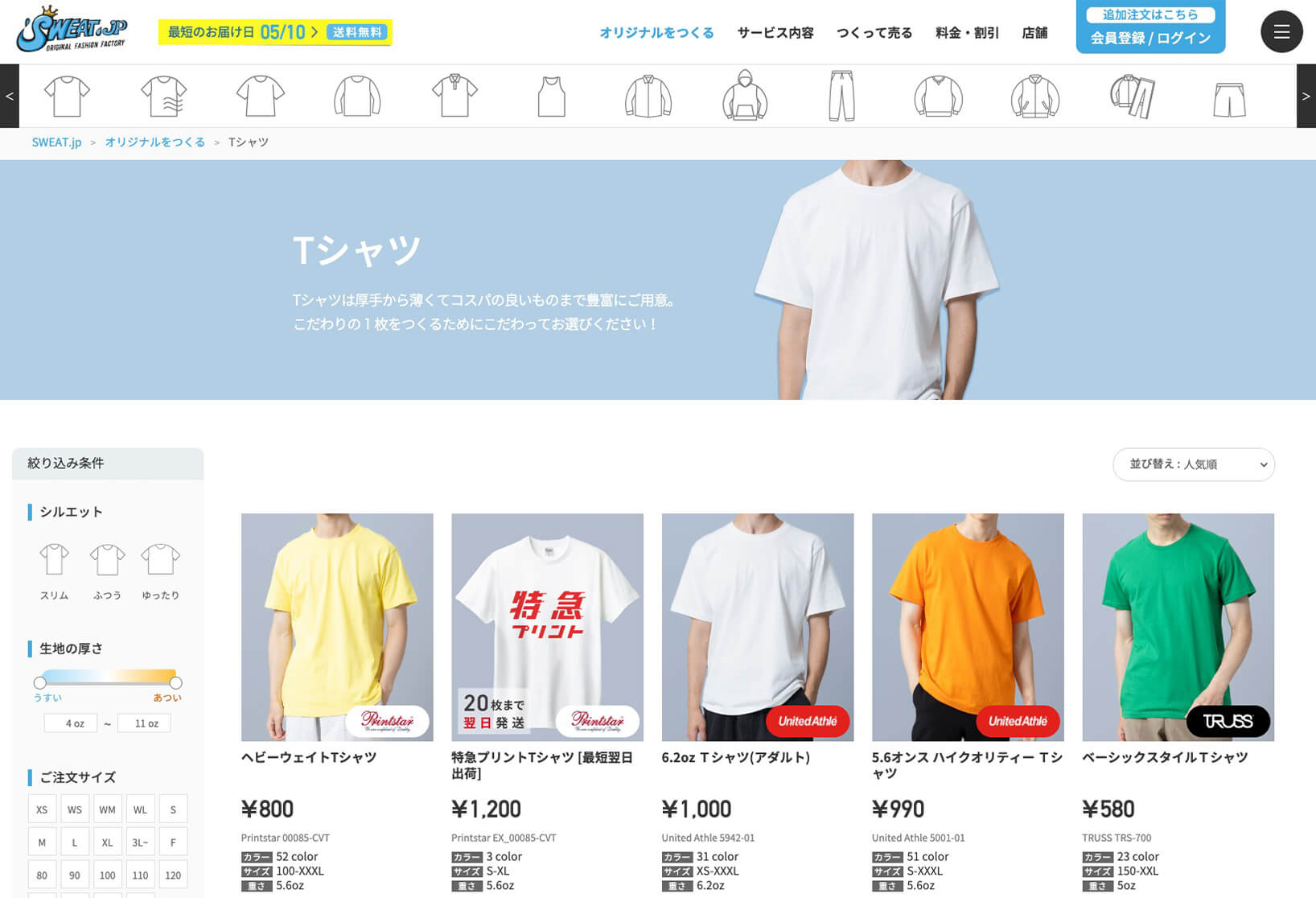 厚手・薄手・素材・シルエット・サイズ・カラーなどを考えて自分のプリントデザインに似合う商品を条件での絞り込み機能を使って探していきます。プリントデザインは自分でつくってもデザインサポートを使って相談しながらでもつくることができます。