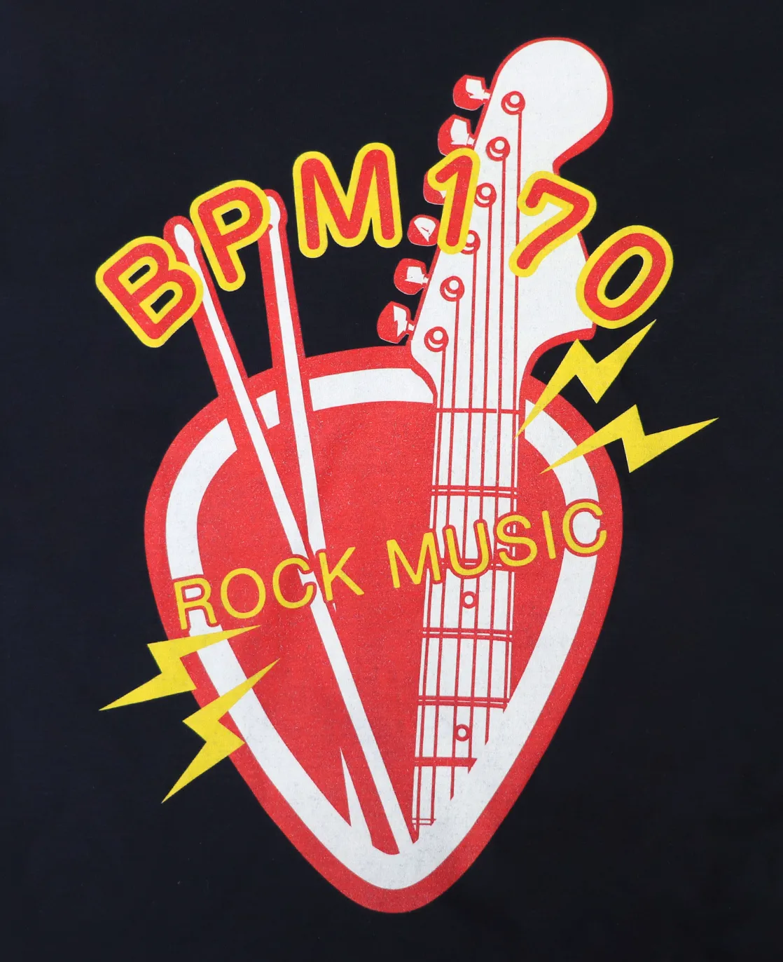 ギターのネックとドラムスティックがピック型の枠と合わさったイラストがオシャレなデザインです。