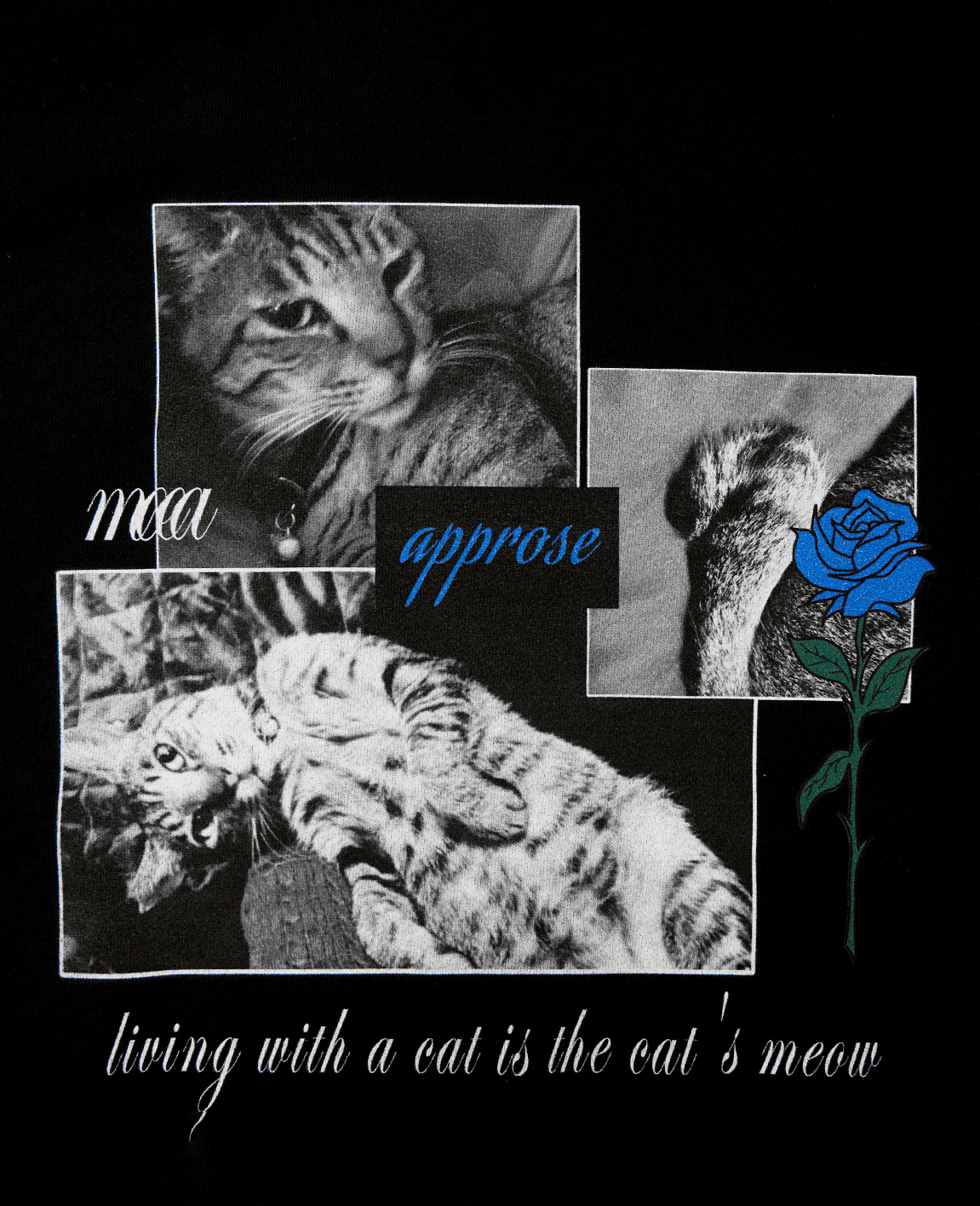 ブラックのボディに、猫のフォトグラフィックをコラージュ風に配置した印象的なデザインです。