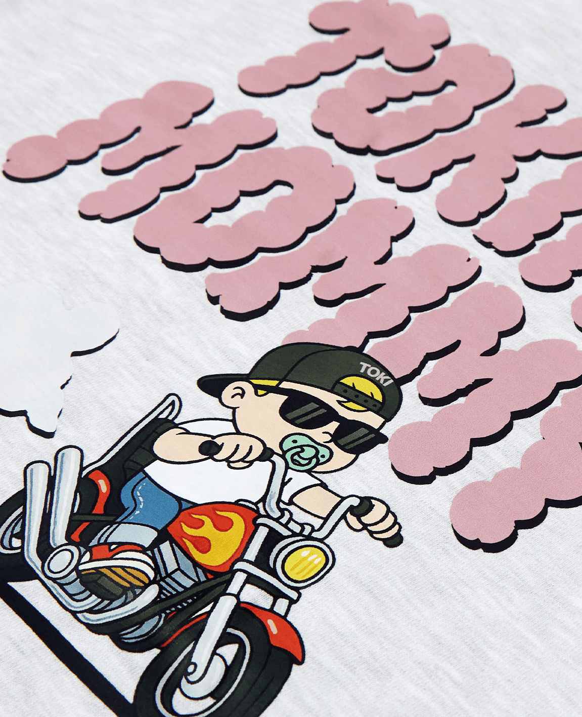 バックにはフロントと同じ「TOKINO MOMMY」のロゴを大きく配置し、さらにバイクに乗ったキャラクターのイラストを組み合わせた遊び心のあるデザインになっています。ポップな文字とイラストがマッチし、インパクトがありながらも親しみやすい雰囲気を演出しています。フルカラーシートでの加工は、デザインの色味がより鮮明に再現ができるので、デザインに色をはっきり出したい人におすすめです。