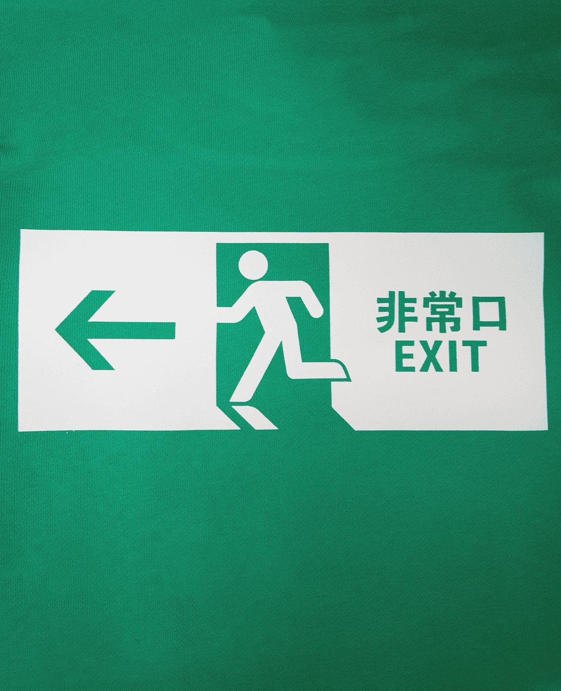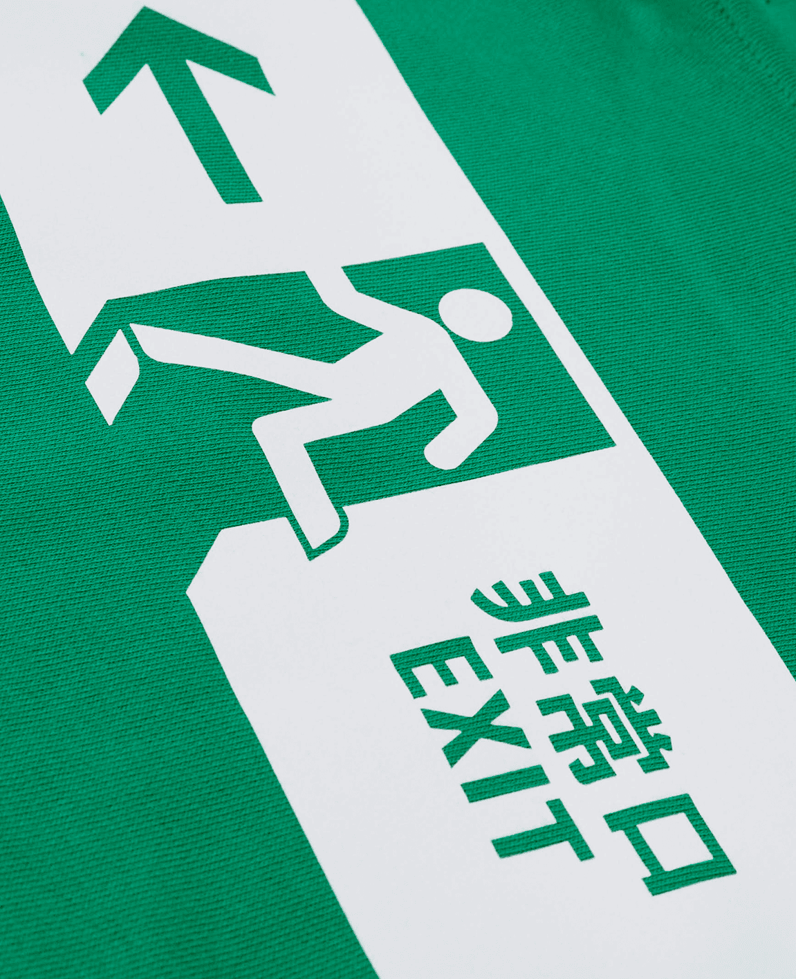 鮮やかなグリーンのボディに、バックへ「非常口(EXIT)」のサインをモチーフにしたデザインを大きくプリントしています。白地にグリーンのピクトグラムとテキストが映え、視認性が高くユニークな仕上がりになっています。単色のデザインをより安価に作成をご希望の方には、単色シートがおすすめです。