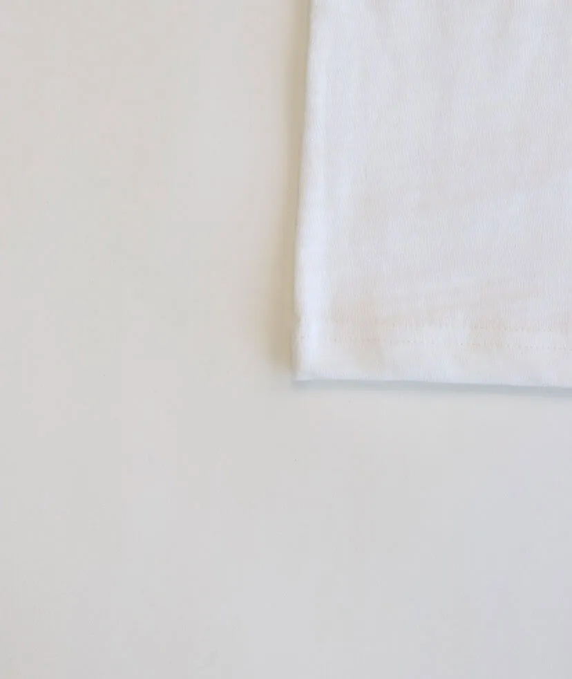 形が均一でないスラブ糸を使ってつくる生地をスラブ素材といいます。表面に凹凸ができて独特の風合いになります。 すこしユーズド感がありこなれた雰囲気。6.8ozとしっかりめの厚みとゆったりしたシルエットがその生地感を活かしています。 ファッションシーンにおすすめ。