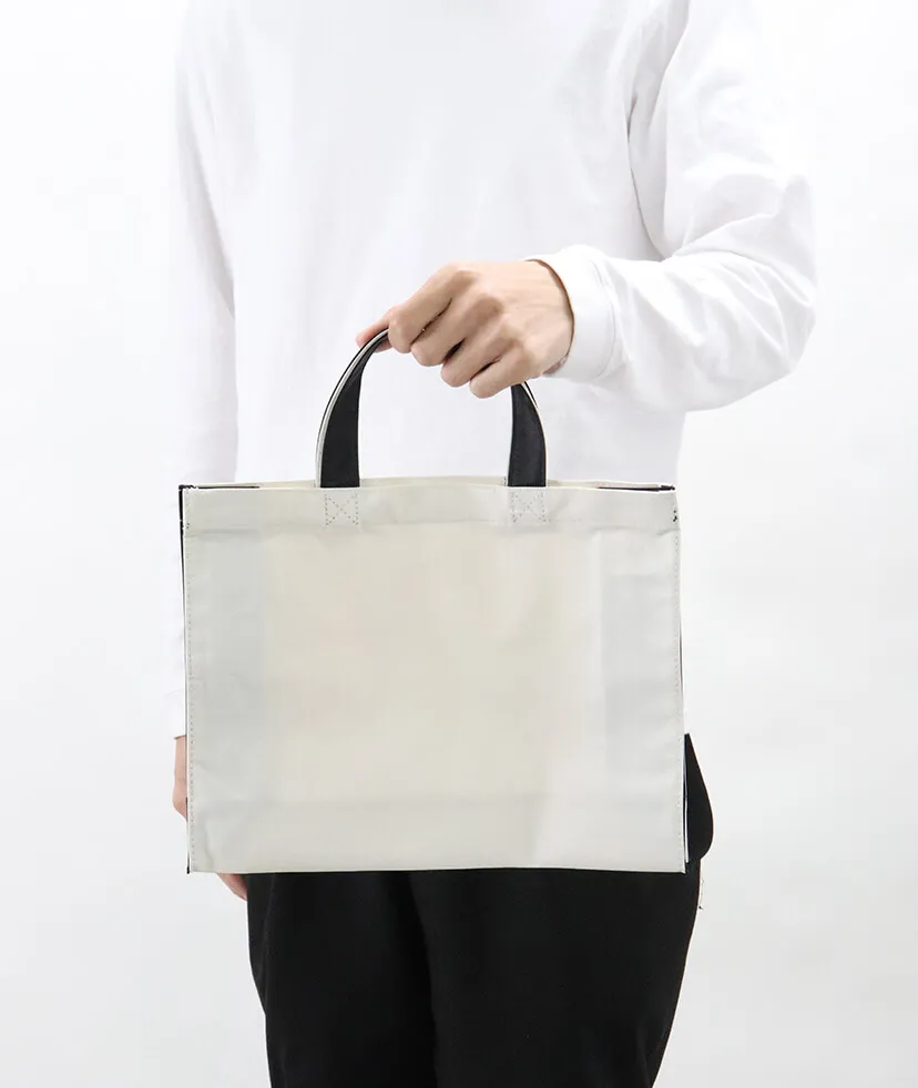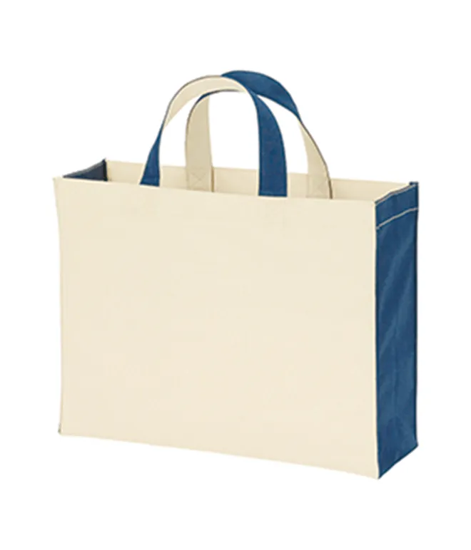 A4サイズで10cm以上のマチ付きトートバッグ。ポリエステルの丈夫な作りと角底タイプで、本や厚みのある書類もたくさん入ります。展示会用の配り物トートバッグやオープンキャンパスなどの資料トートバッグとしても活躍が期待できます。カジュアルなアクセントカラーが嬉しい7色展開。