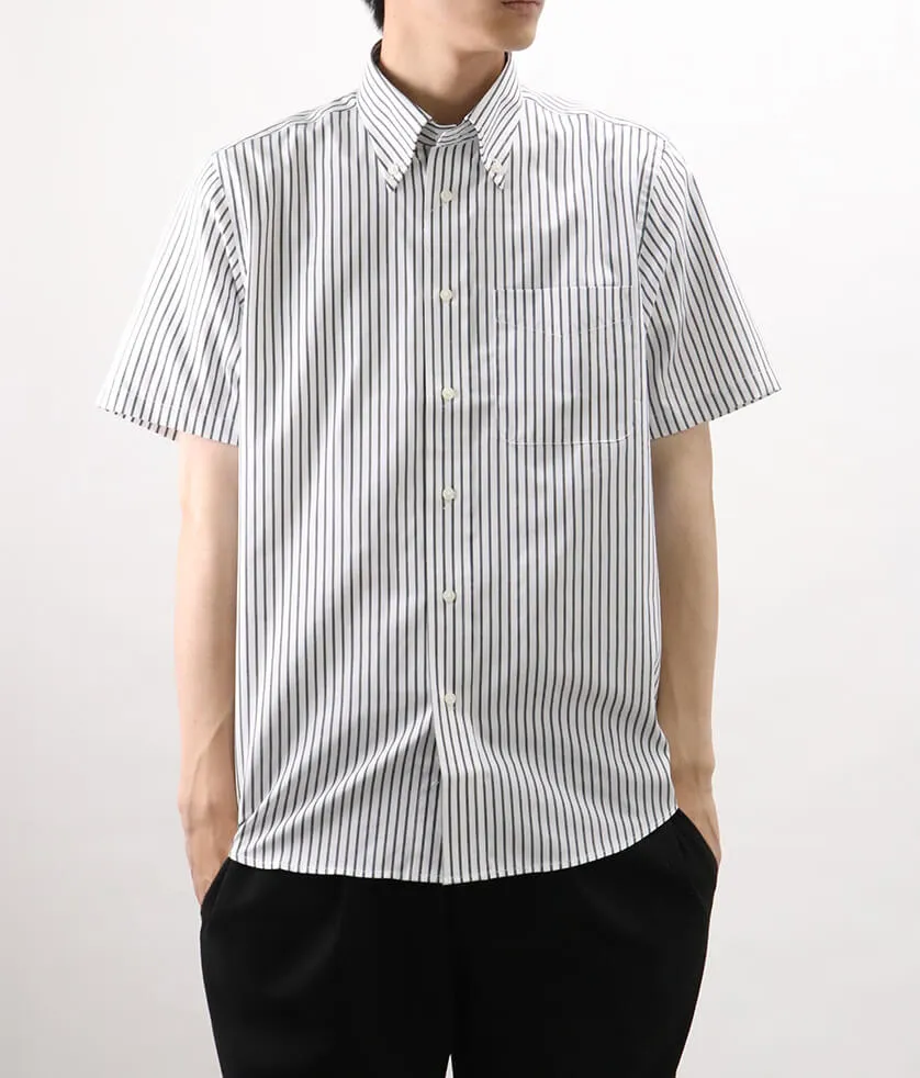 ストライプは爽やかで清潔感のあるイメージを持ちます。スマートにも見えるのでショップの制服などで広く人気です。 左胸のアウトポケットと背中のサイドタックがあり、動きのある環境でも人気の1枚です。