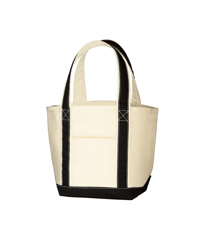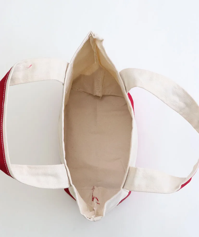 ちょっとした外出に便利なサイズのバイカラー配色が冴えるトートバッグです。広めの底マチが使いやすく、生地も厚手なのでバッグ単体で自立もします。同仕様でMサイズ、Lサイズもございますので、お好みのサイズからお選びください。