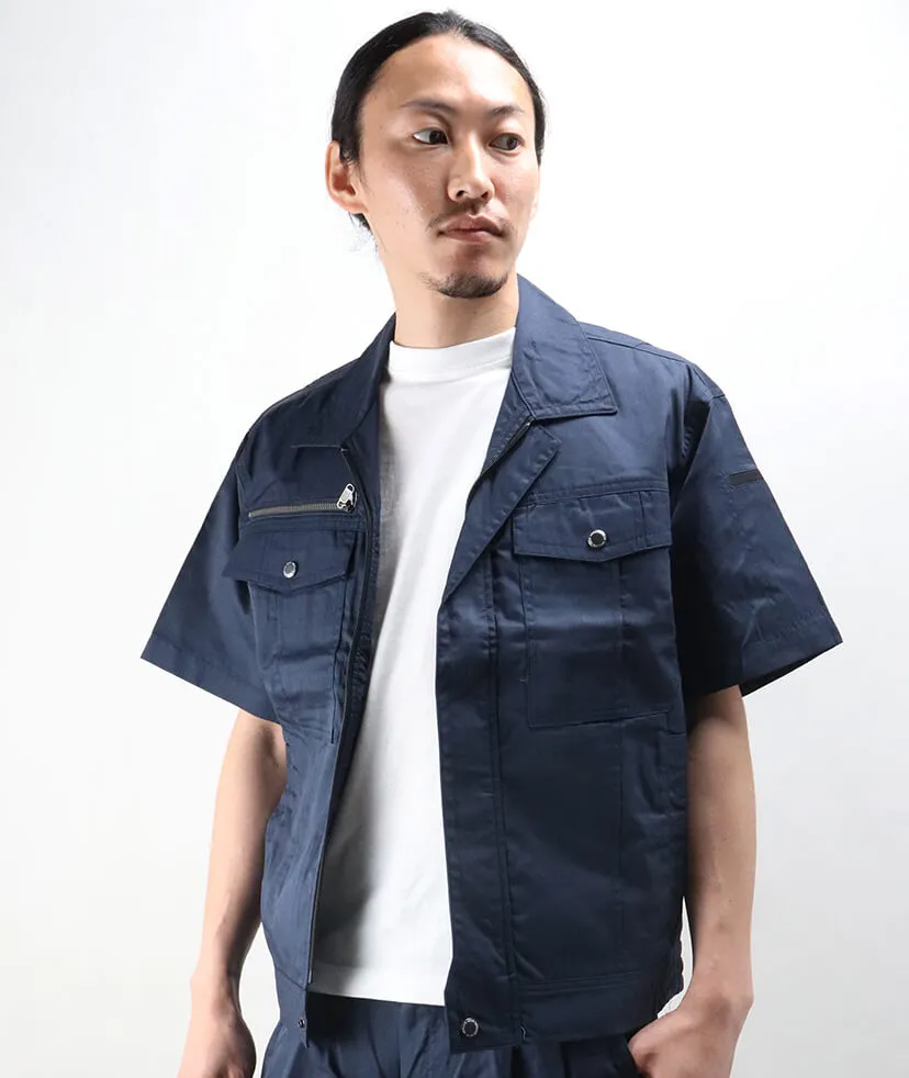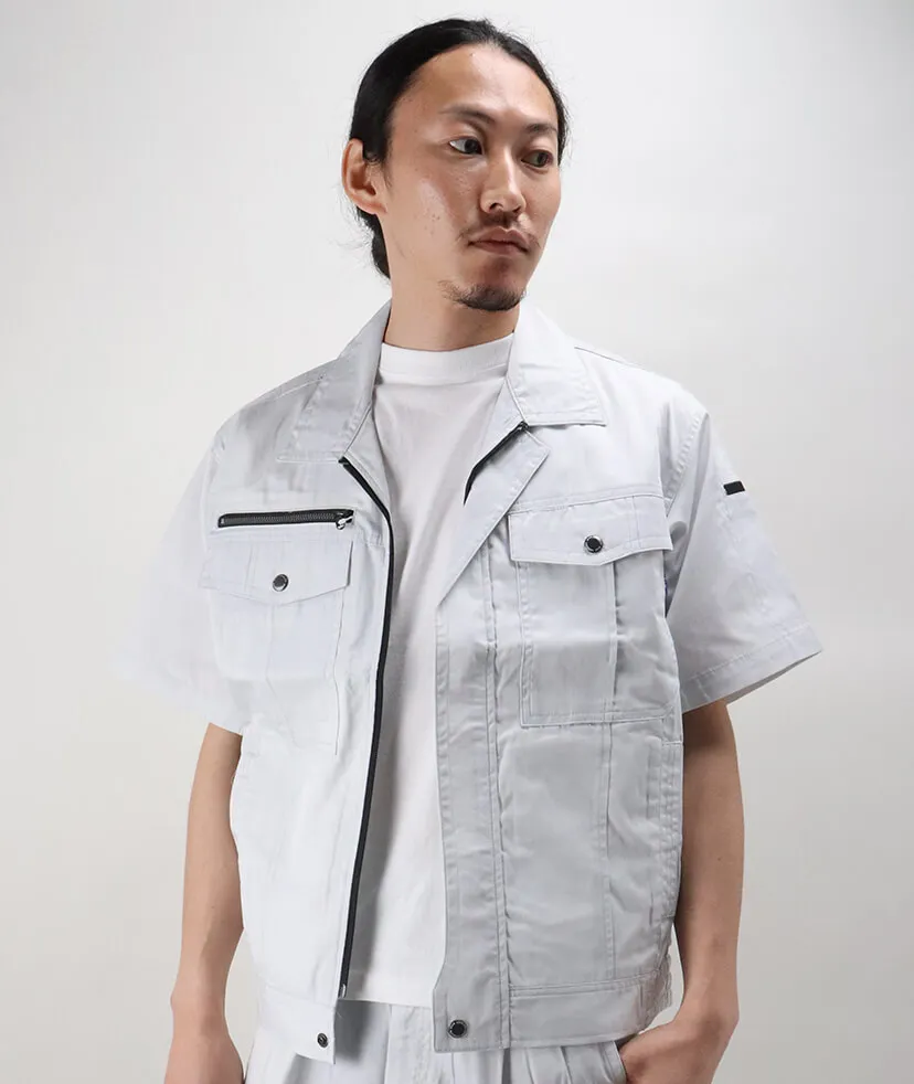 ポリエステル中心のサラリとした素材なので涼しく動きやすい軽く着られる半袖シャツです。裾が脇ゴム使用で腰回りもスッキリ魅せれる半袖ブルゾンです。