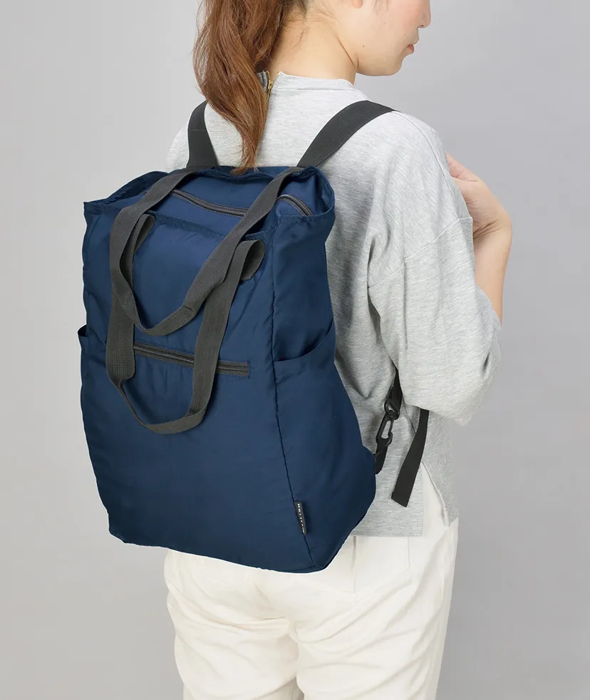 リュックとトートになる2WAY仕様のバッグです。 ポケットに小さくまとまるポケッタブルタイプで、トラベルや出張時に重宝します。 また、洗濯できるのもポイントです。 ぜひ、キャンペーンのプレゼント品などの高級ノベルティとしてご提案ください。