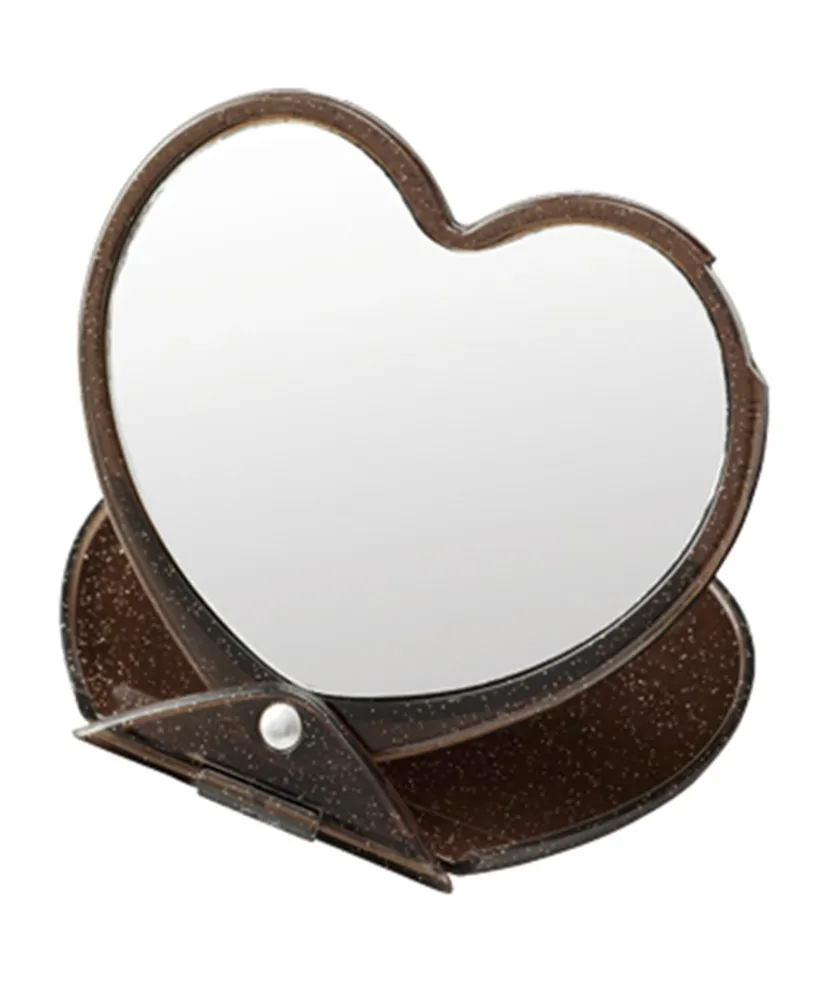 ラメ入りのボディとハート型が抜群にかわいいスライドミラー。ポーチに入るコンパクトなサイズながら、フタ部分は折り返してスタンドタイプに出来るので、机の上に置ける使い勝手の良さも魅力です。名入れ範囲が広く取れ、アパレルや音楽グループのロゴが映えます。厚さ9㎜と薄いので郵送できるノベルティとしてもおすすめです。