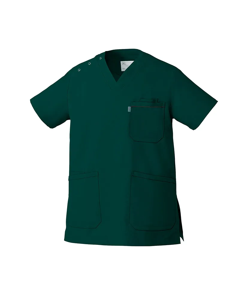 スポーツメーカー「ミズノ」と共同開発した医療用スクラブ。 動きやすさはもちろんのこと、工業洗濯対応のタフな耐久性、速乾性にも優れています。 ゆったりした着心地の男女兼用デザイン。 かがんだときに胸元が見えないようになっている安心設計。 長めの着丈で、かがんだ際に腰回りやインナーが見えない設計になっています。