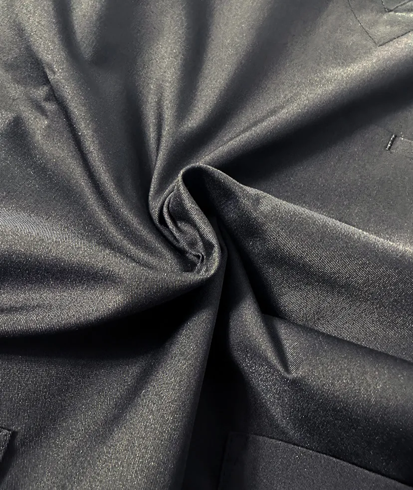 光沢に優れた上質なスパンデックス繊維を利用したストレッチ性のあるギャバジン生地です。 表面には特徴的な斜めの模様が現れ、裏面は滑らかになります。