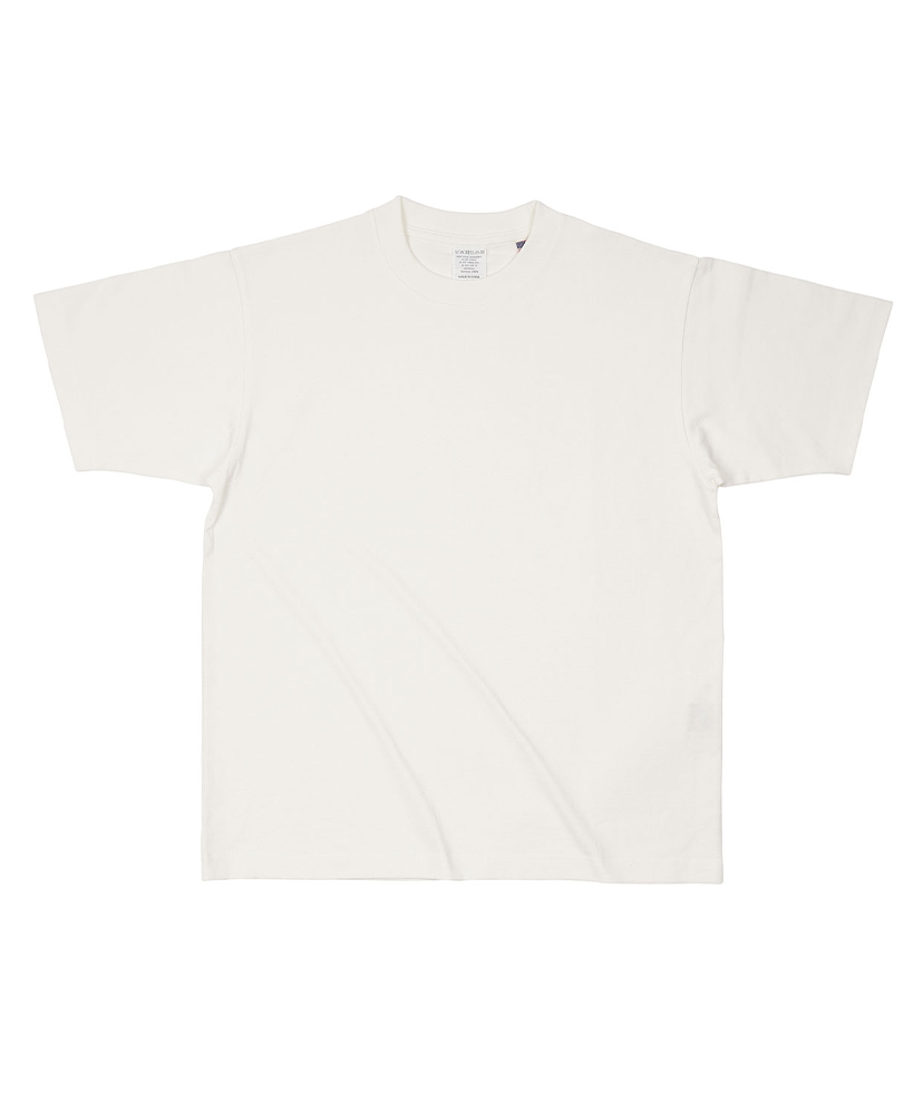 米綿100%のオープンエンド糸を使用した8.1 oz Tシャツ。 アメリカで生産される綿花の特徴は、中国綿などと比べて油分が少なく、独特のシャリ感(乾いた肌ざわりで硬めの質感)があります。 襟の洗濯ネーム・左裾(後ろ内側)は簡単に手で切り取ることのできる素材を使用しています。