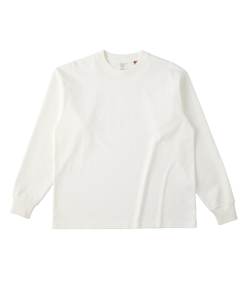 米綿100%のオープンエンド糸を使用したロングスリーブTシャツ。 アメリカで生産される綿花の特徴は、中国綿などと比べて油分が少なく、 独特のシャリ感(乾いた肌ざわりで硬めの質感)があります。 襟の洗濯ネーム・左裾(後ろ内側)は簡単に手で切り取ることのできる素材を使用しています。