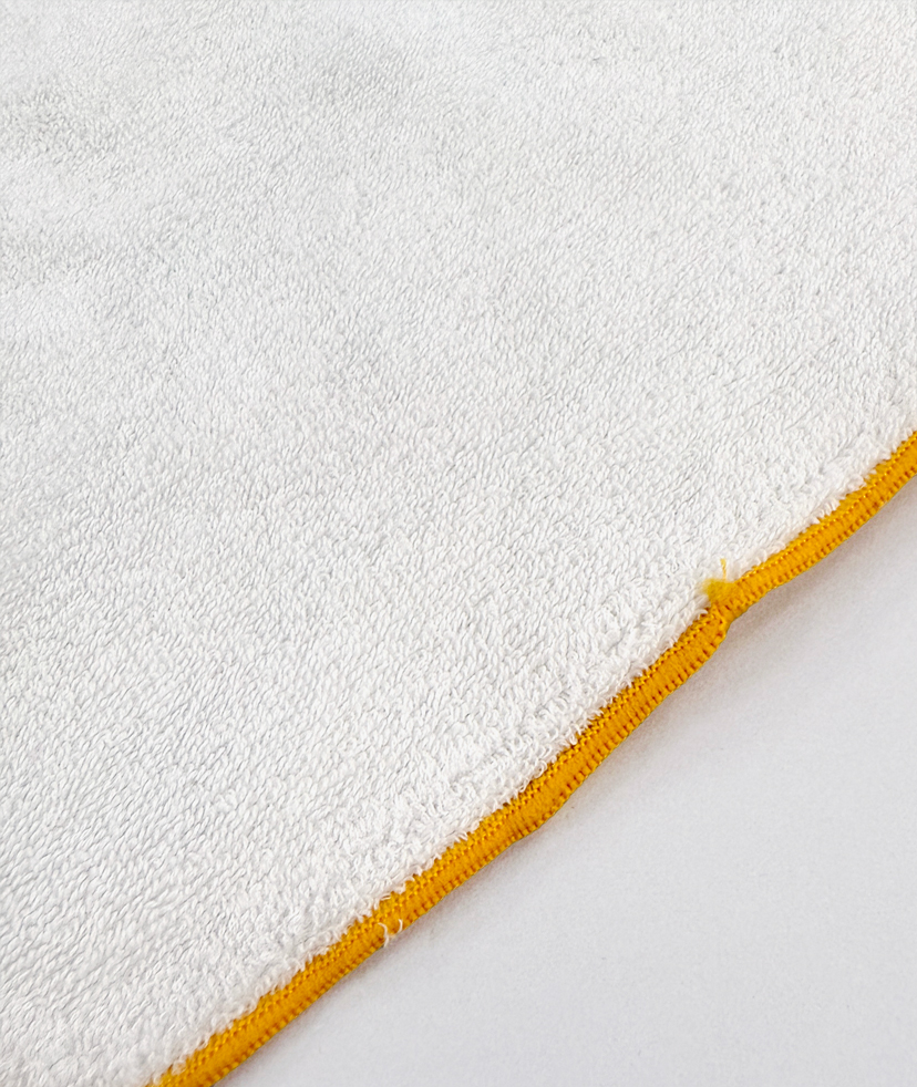 フルカラーインクジェットプリントで全面プリントができるタオルです。 ヘム部分は折り返し・ミミ部分はメロー縫製になっています。