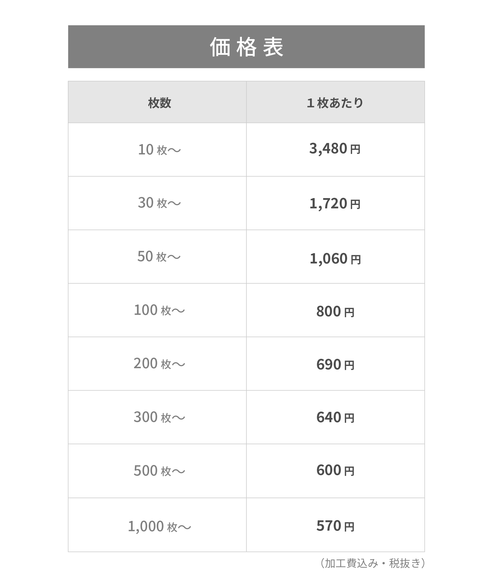 ※ご注文は10枚からの受付になります。 ※ご注文から出荷まで最短12営業日いただきます。 ※価格表は1色の場合のお見積りとなります。2色以上の場合は別途見積もりいたします。