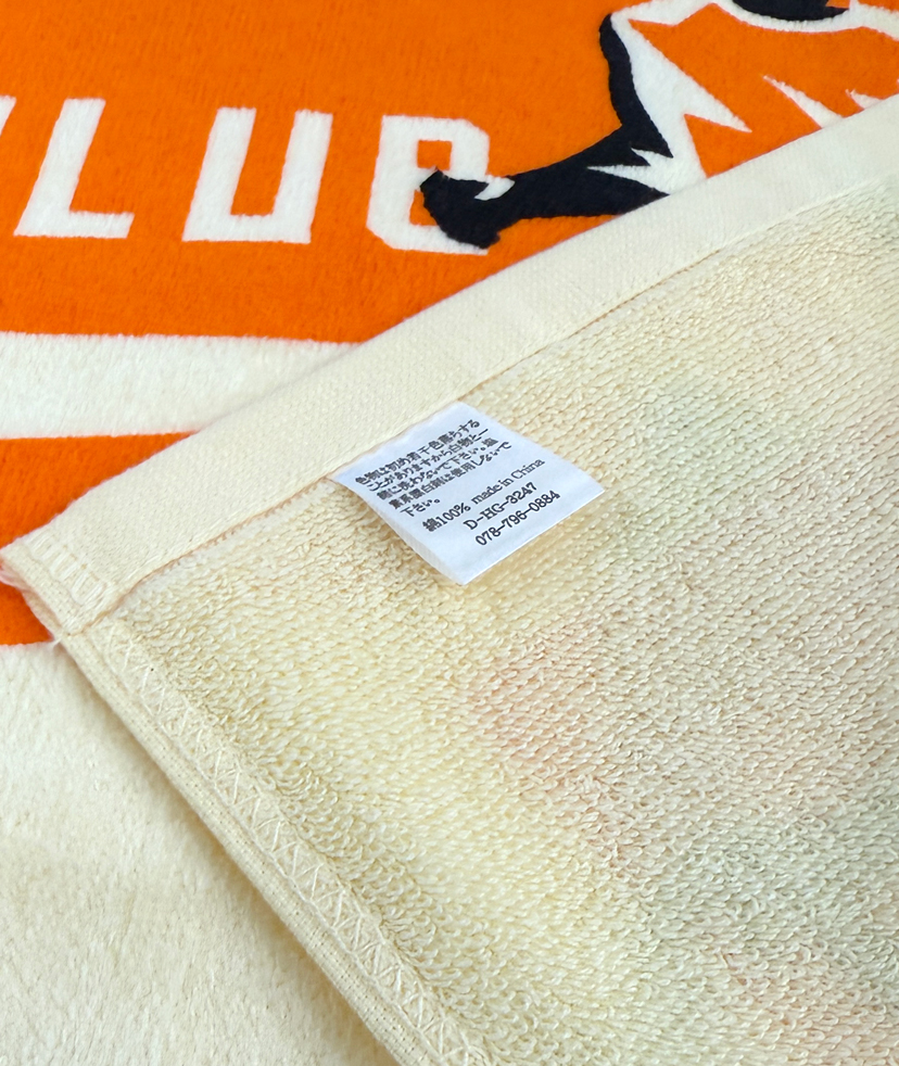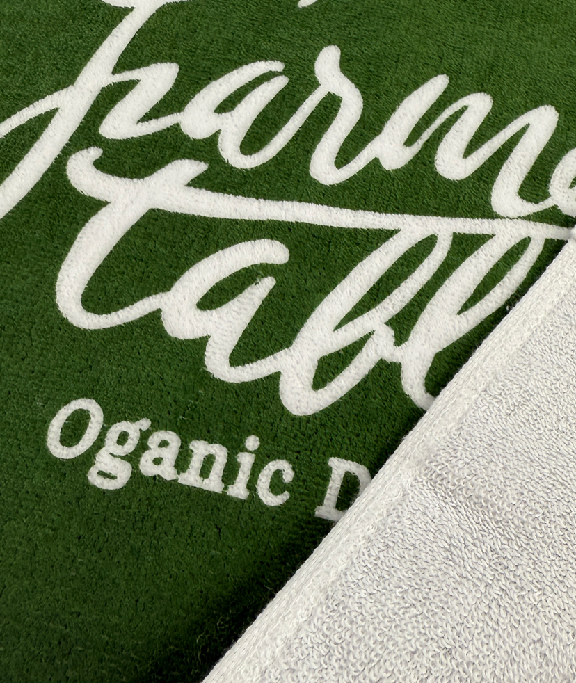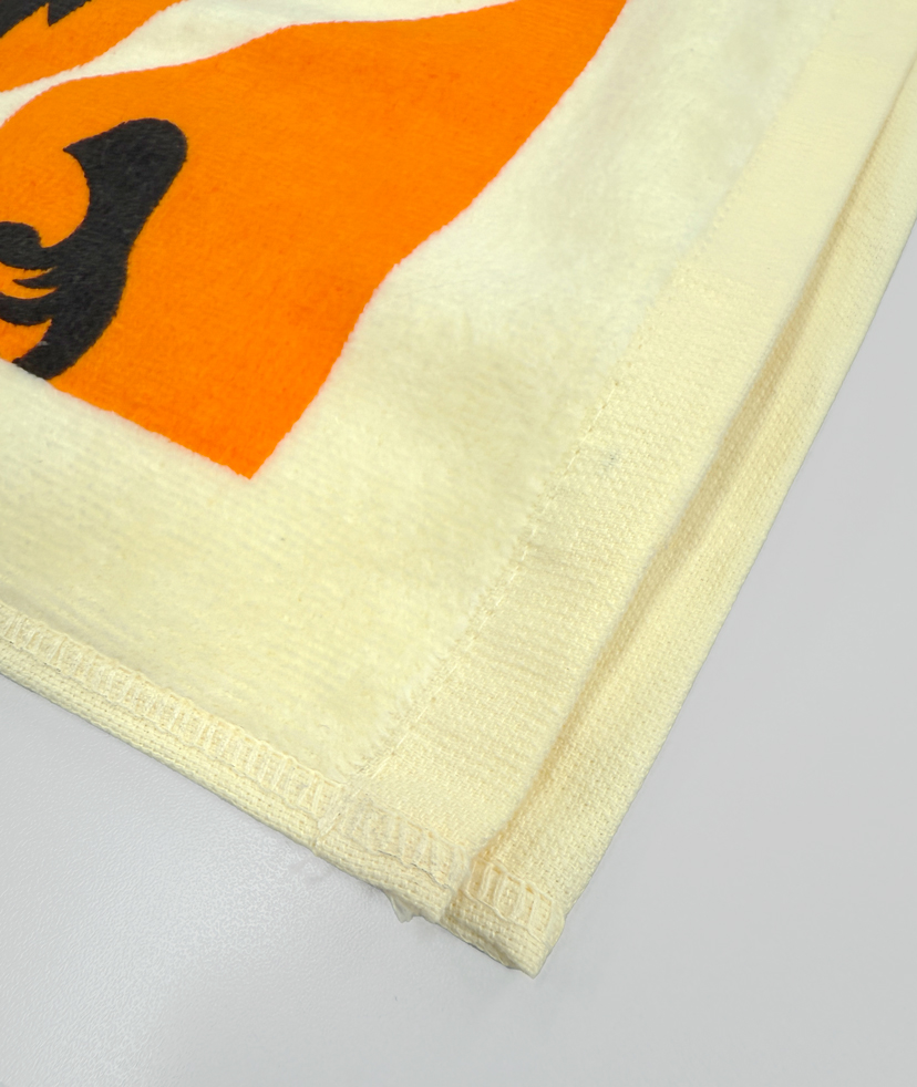 タオルの中央にだけプリントができる「フレームプリント」 カラー生地へのプリントは本体色とプリント色が混じるので、黒や紺など同系色の暗い色でプリントするほうがおすすめです。
