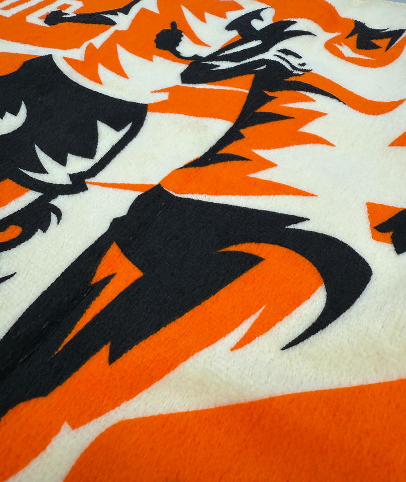 表面のパイル(糸のループ)を刈り、ビロード調にする事によりデザインをキレイに表現する事ができます。また肌触りが良く、高級感があります。