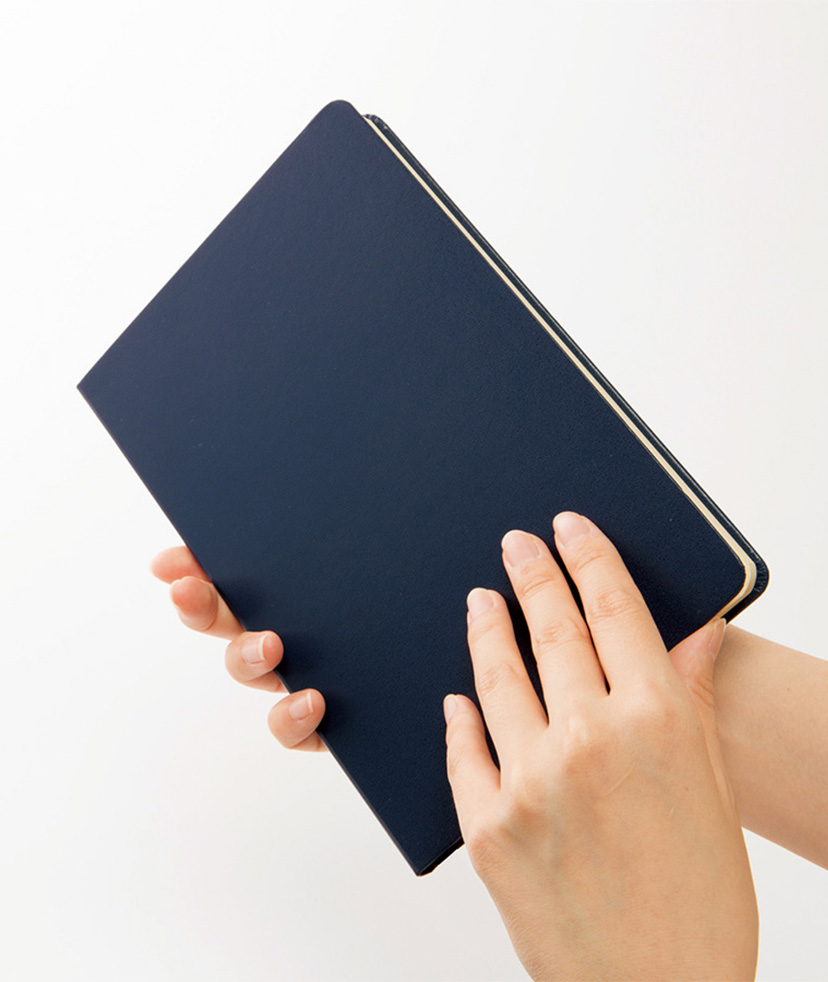 使いやすいA5サイズのハードカバーノートです。 表紙のハードカバー素材にはPUを使用し高級感のある仕上がりに、 またノートの罫線の色味や幅にもこだわっており、長時間使用しても目の疲れにくい仕様です。 ホワイト、ブラック、ネイビーの定番カラーに加えて スモークブルー、グレーのビジネスシーンにもぴったりな落ち着きのある5色展開です。 名入れがよく映える落ち着いた色味は、様々な案件に柔軟に対応できるため 業界を問わずオリジナルノベルティの作成に人気のあるシリーズです。