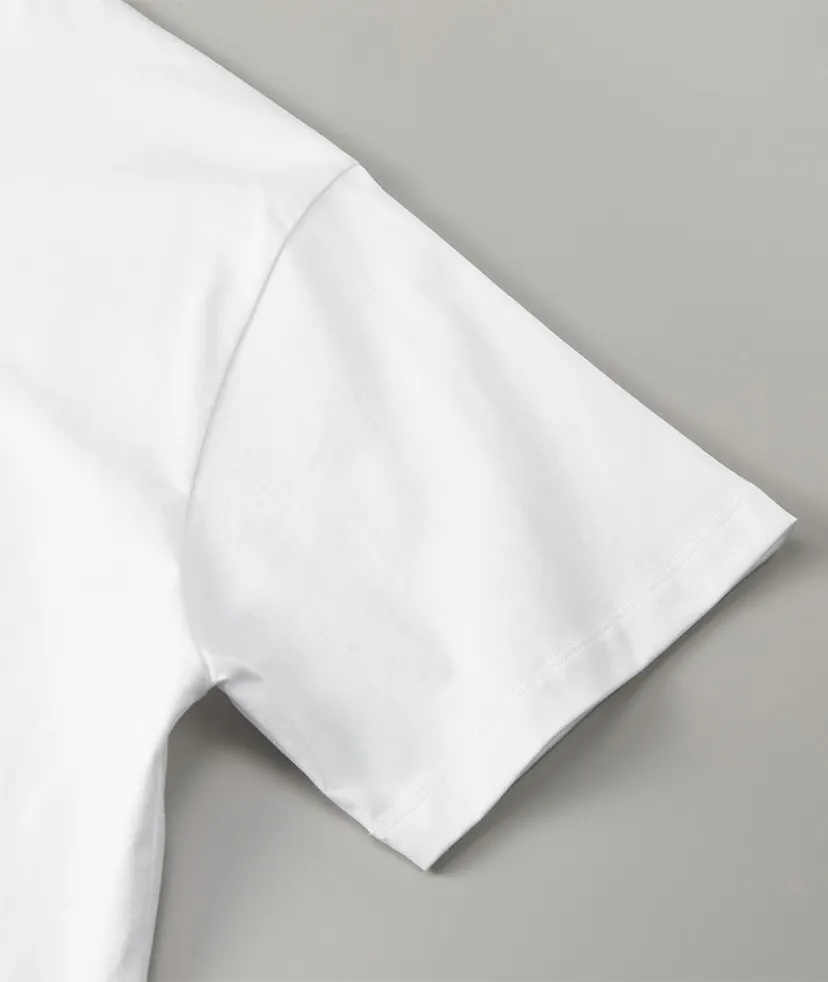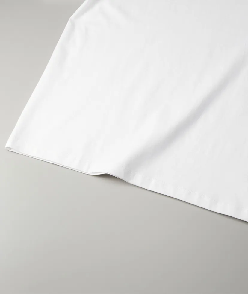 生地に「コンパクトコーマ糸」を採用することで、毛羽立ちが少なくなめらかなさわり心地の上質な雰囲気を実現しました。さらに、サイジングやディテールも生地に合わせて調整。首リブ幅やステッチワークを洗練された印象になるよう設計し、ほどよくドロップした肩と少しゆとりを持たせたボックスシルエットに仕立てることで今の着こなしにマッチさせました。セレクトする着用サイズによって「ワイドパンツとも合わせやすい短丈のトレンドスタイル」から「こなれ感を演出するビッグシルエット」まで、幅広いスタイル変化が可能。洒脱なコーディネートが完成する珠玉の一枚です。